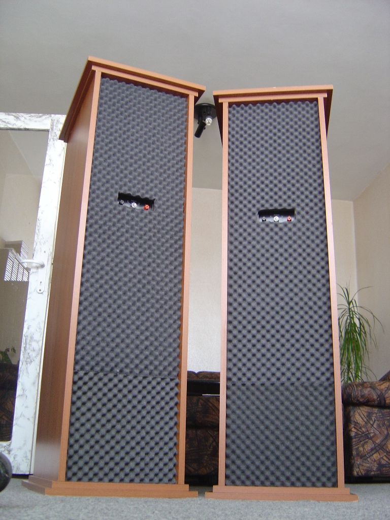 Както правилно е забелязал Нанко,на гърбът на колоната е поставен акустичен панел,патент :D на ДРГеоргиев.Има наистина освен визуален,но у положителен акустичен ефект!А отпред има обикновена предпазна решетка,която неминуемо ще влошава звукът,но щом има деца ,които пипат-няма друг начин.
