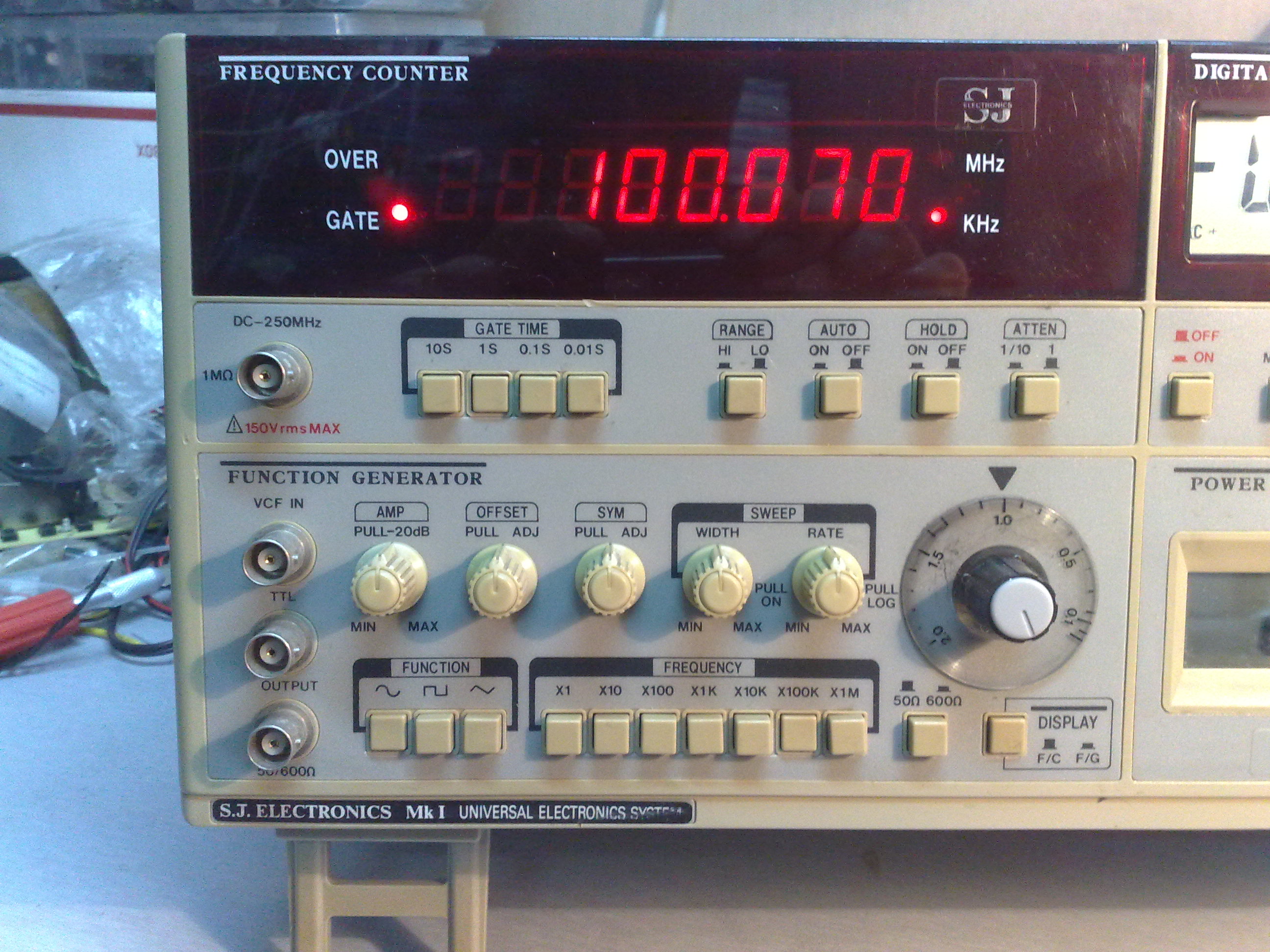 3. Многофункционален генератор 10 Хц -2МХц, вътрешна връзка към честотомера, два изходни импеданса 600 ом и 50 ом, 3 вида сигнали с модификации, SWEEP. офсет, атенюатор -20ДБ, Изходен сигнал 50 мВ до 7.4 В RMS sinus
