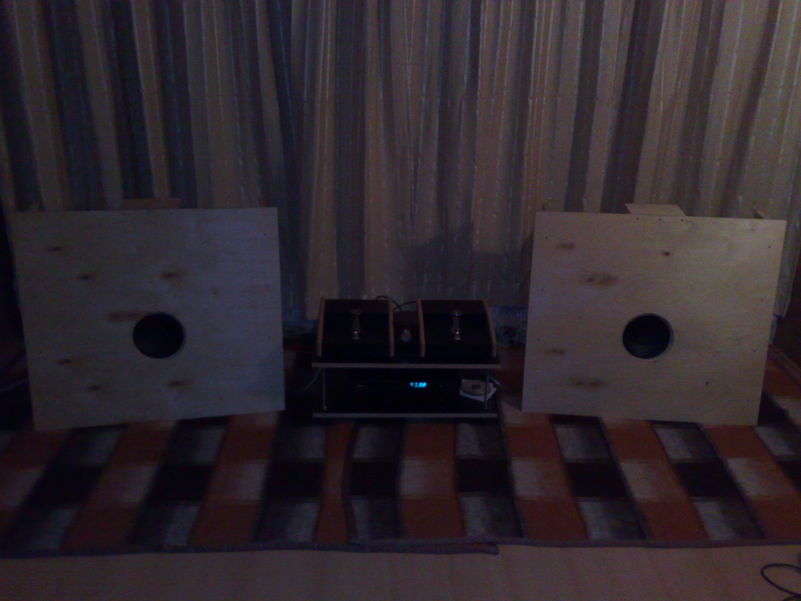 От дадените снимки не се вижда как точно си закрепил говорителите към шперплатовите екрани, но ако ти се занимава, можеш да декуплираш механически шаситата им от самите екрани. Примерно изрязваш два обръча от филц, с дебелина примерно 5 или 10мм, подлагаш ги помежду им и осигуряваш стабилен механичен контакт на говорителя към пода посредством дървена греда, хваната в долната част на магнитната му система. По този начин звукът се освобождава от цялата звукова мъгла, която вкарват панелите, които иначе акумулират в себе си вибрациите, предадени от шасито на говорителя. Пробвано. Гарантирам минимум 200 процентно подобрение на звука.