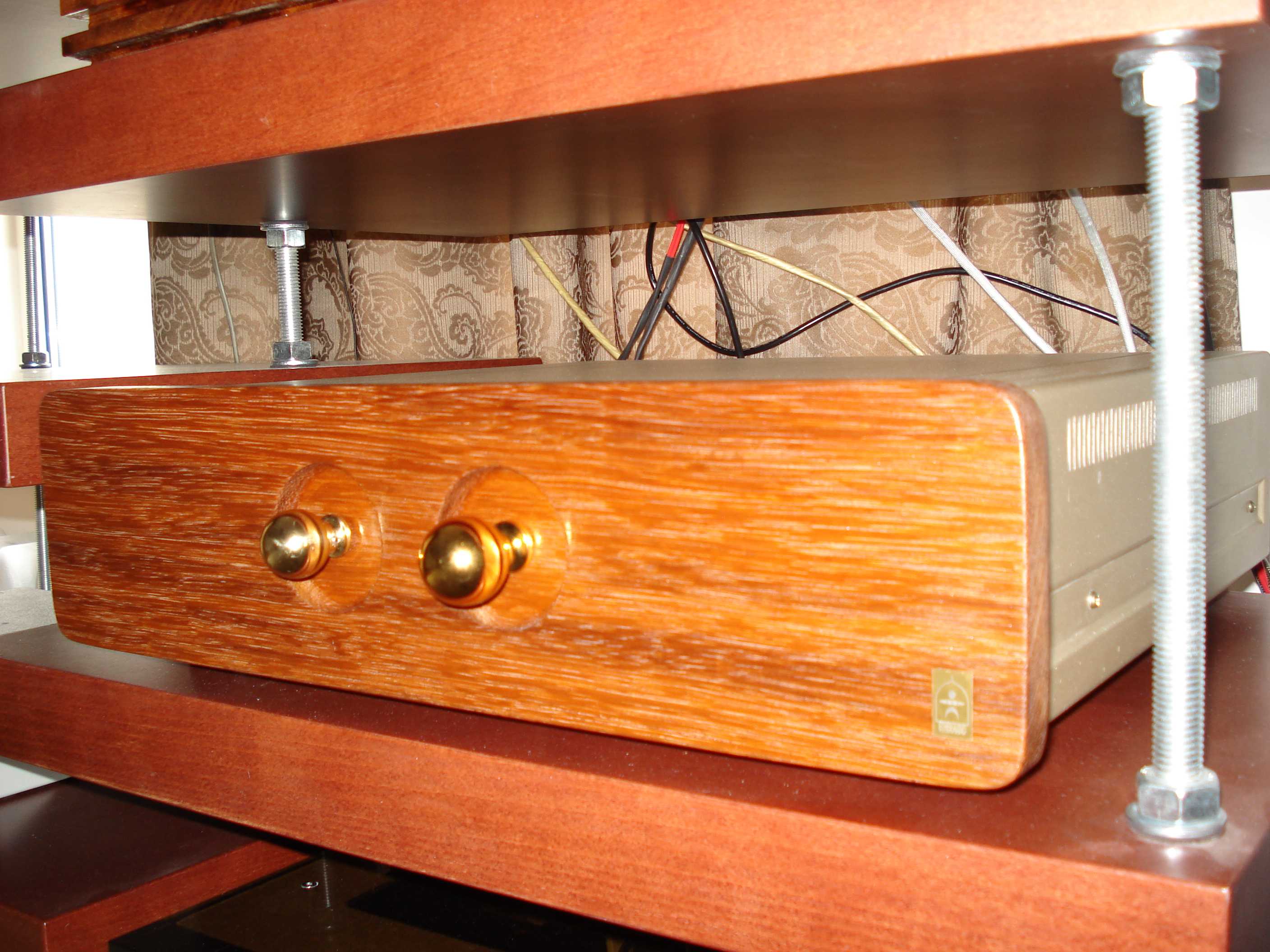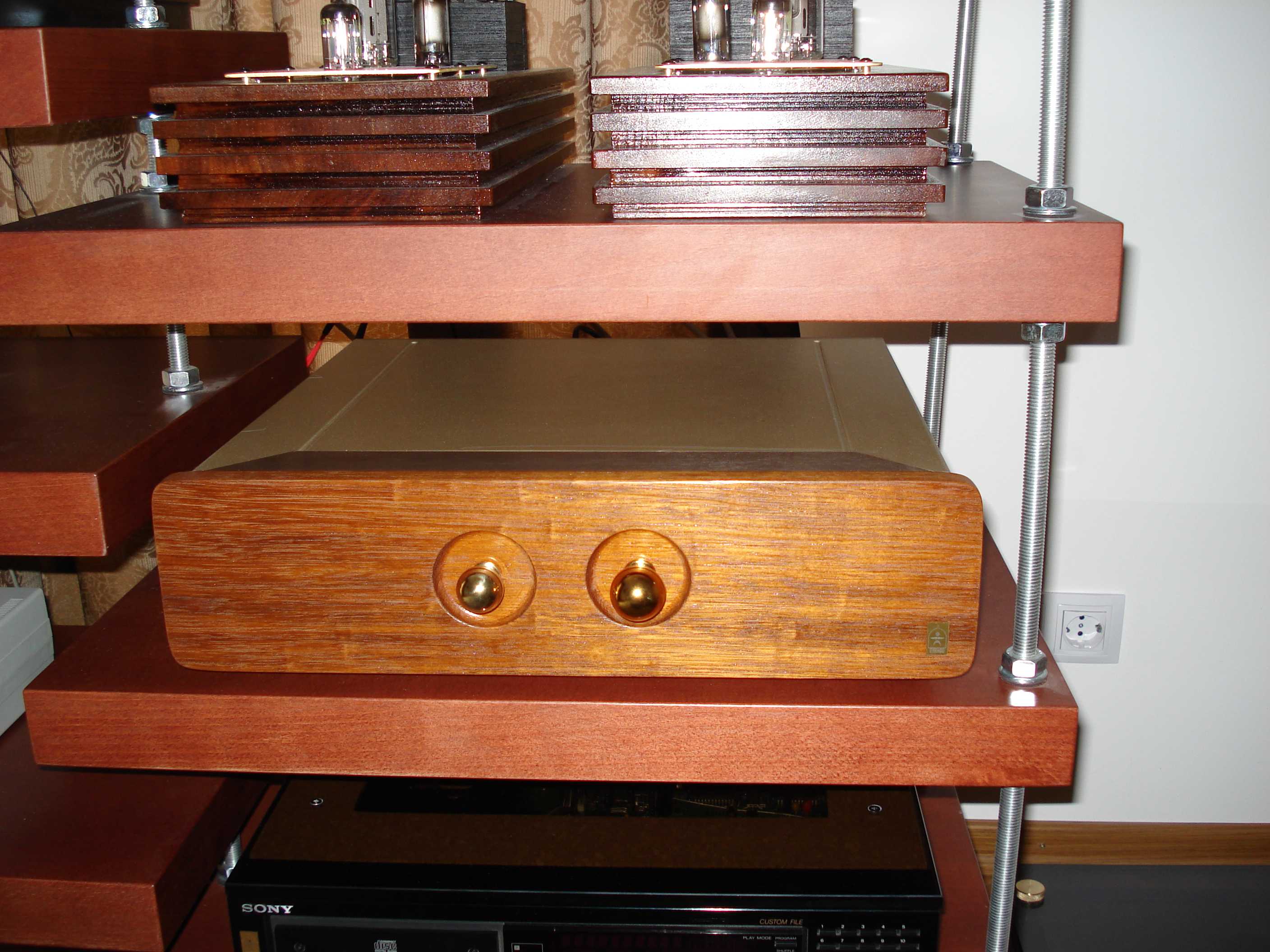 Боби, първоначалната идея беше да е рамка, като акцентирам на стъклото, както бях направил и със Синьото хапче и с RIAA коректора. Мислех, да са пак отделни моноблокове, но направени от същата рамка и същото стъкло, като по този начин отделните компоненти се вържат като от една серия. Отказах се от тази идея (не само, защото ми се стори скучно), но и заради високата температура, която ГУ-50 отделя и щеше да се отрази зле на стъклото. Друг минус на тази концепция е сравнително нестабилното закрепване на самото стъкло върху рамката. Мисля си, че дебелите основи ще ми предоставят по-лесно възможността за монтаж на елементите (повече свободно пространство), както и ще придадат допълнителна маса на отделните моноблокове, което ще се отрази положително.