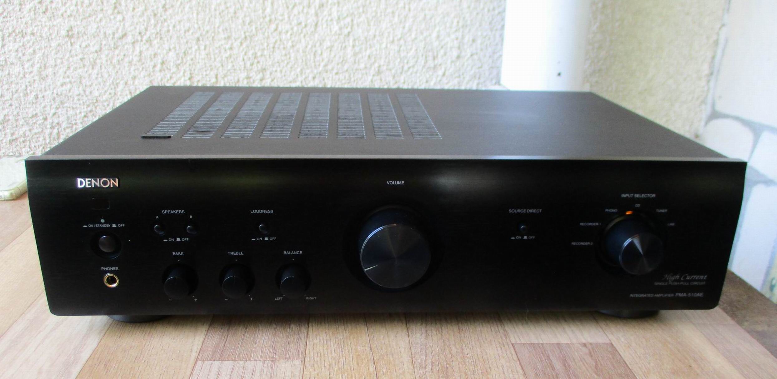 DENON PMA-510AE – Интегриран усилвател с увеличена динамика на звука и оценка 5 звезди. Възможност за дистанционно. High Current (HC) Single-Push-Pull схема за детайлен и мощен звук. Голям динамичен обхват на звука, с поддръжка на високопрецизни аудио източници. Signal Level Divided Construction (SLDC) шасито, конструирано от DENON, се използва в аудио веригите, за да осигури усилването и предаването към озвучителните тела и на най-деликатните аудио сигнали, възпроизведени от DVD или CD дисковете. Мощен – 45 watts per channel into 8Ω (stereo) при клирфактор – 0.07%. Входове грамофон и линейни – 2.5mV (MM), 100mV (line). Висока динамика – 105dB (line), 84dB (MM). Работи с колони от – 4Ω to 16Ω. Размери – 434 x 121 x 307mm. Тегло – 6.5kg. Перфектен технически и с добър външен вид. Цена като нов – £269.00. – 180 лв.