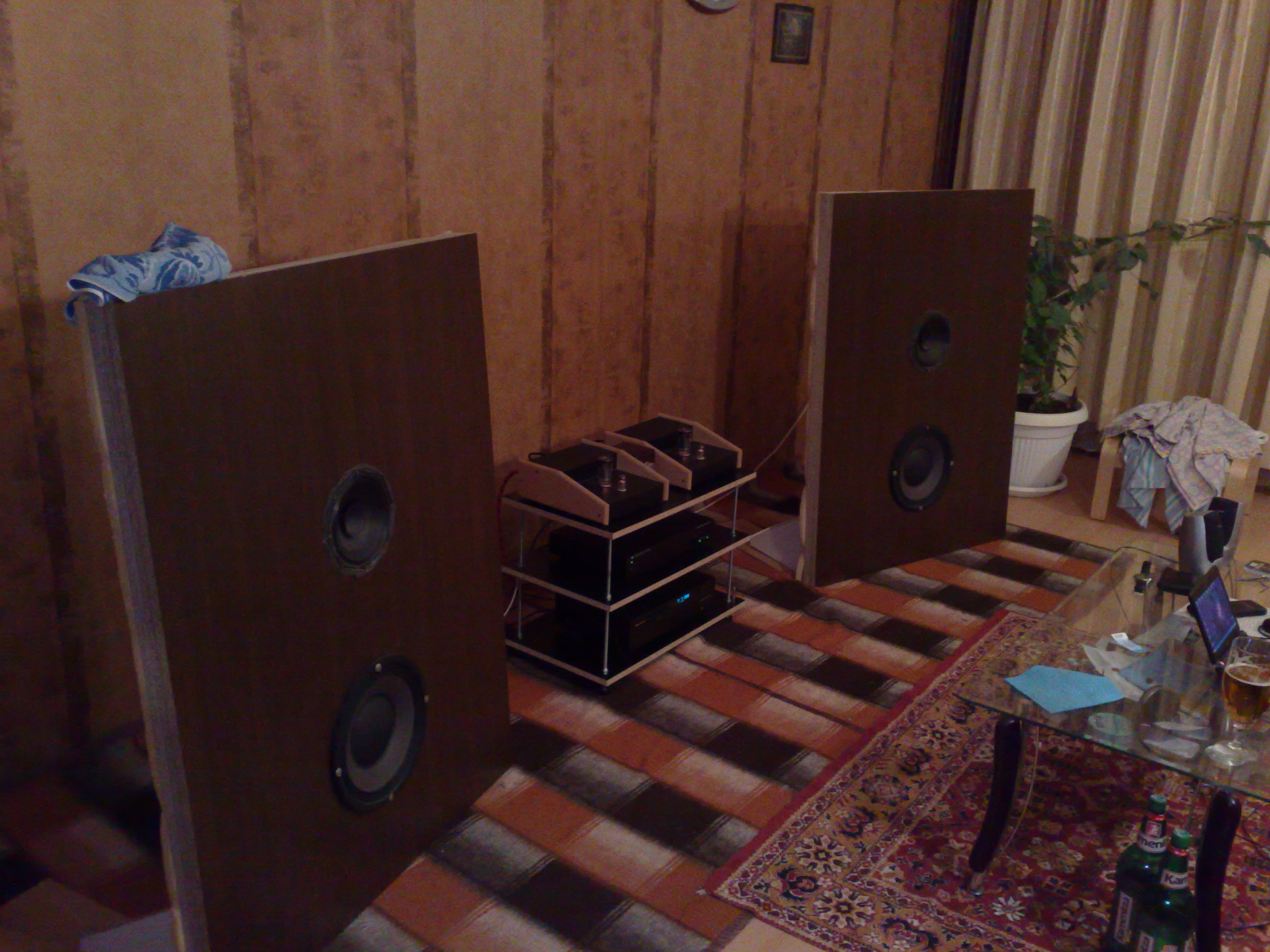 Еми след като чух отново няколко трака на Gipsy Kings, Michael Jackson, Celine Dion и Chris Rea... Имаше един период от около 10 мин, в който имах нужда някой да ми държи ченето да не падне. Добре се получи, но това в само преходно, какво съм замислил..... дано до нова година да го реализирам. Екрани тип "сандвич" както някой им викат, а именно два панела с кварцов пясък.... 12фулл и 15 басс