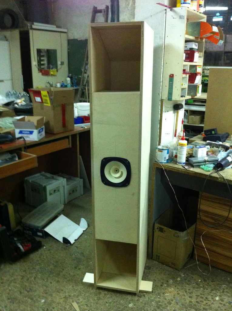 Изработени са от 18мм 13 пластов брезов шперплат WISA S/BB. Отвън допълнително са покрити с 12мм МДФ. Имат и черни крачета. Извинявам се, снимката е много стара и колоните са без МДФ покритие и крачета. Ще се опитам да взема актуални снимки през идните дни.